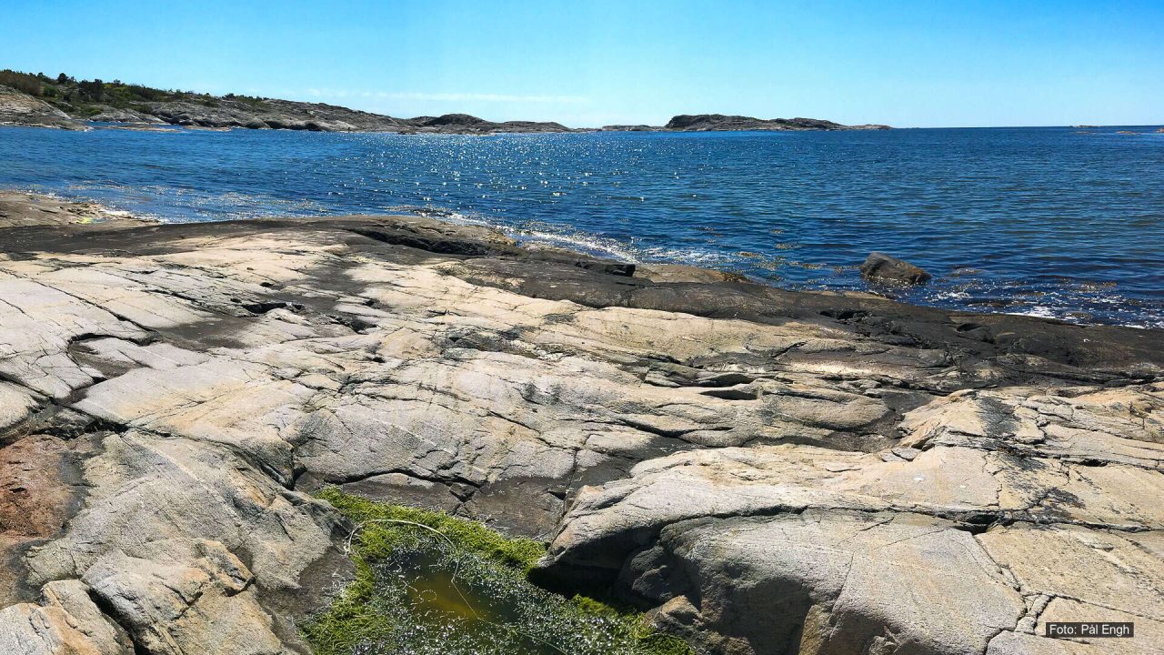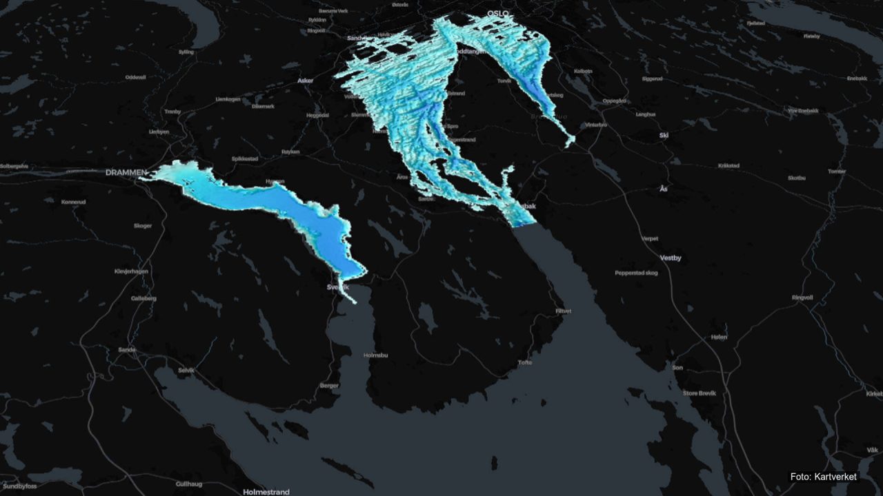 Under vann i Oslofjorden finnes dype daler og høye topper, nesten som på land. Sjøområdet er grått i dette kartet. Her møtes ferskvann fra elver og saltvann fra havet, og vannet legger seg i lag. Små endringer i vær, temperatur eller saltinnhold kan påvirke livet i fjorden.